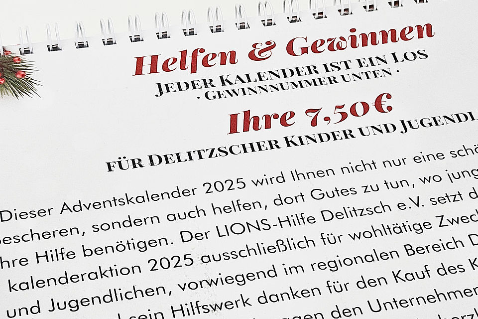 Der Verkaufserlös geht vollständig an gemeinnützige Vereine und Organisationen, deren Schwerpunkt im Bereich der regionalen Kinder- und Jugendförderung liegt. Gewinnen werden nicht nur die Spendenempfänger der Charity-Aktion, auch alle Kalenderinhaber selbst sind zu einem Gratis-Glühwein am Stand der LIONS auf dem Delitzscher Adventsmarkt vom 05. bis 07.12.2025 herzlich eingeladen.