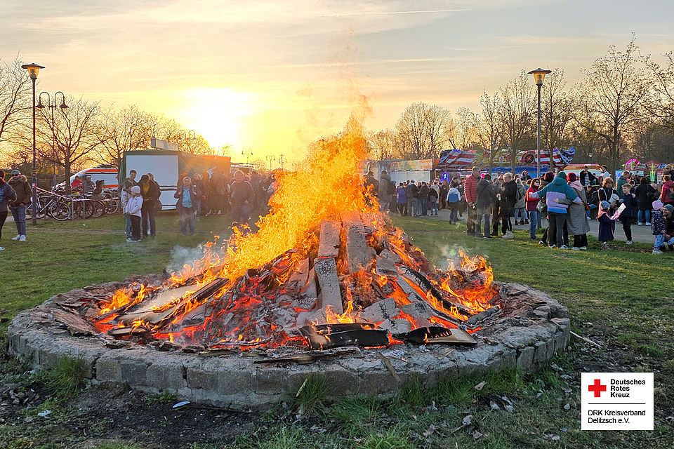 Anschließend spazierten hunderte Delitzscher gemeinsam mit dem Jugendrotkreuz und der Jugendfeuerwehr in Richtung Tiergarten, wo weitere Salutschüsse den freiwilligen Kameradinnen und Kameraden der Feuerwehr Delitzsch das Zeichen zum Entzünden gaben. Grillwürste vom DRK Einsatzzug und die Fahrgeschäfte der Schaustellerfamilie Richter waren eine kurzweilige und schöne Eröffnung der Osterfeiertage. Wir bedanken uns bei allen Gästen, Mitwirkenden, Organisatoren und Unterstützern, welche diesen schönen Abend möglich gemacht haben.