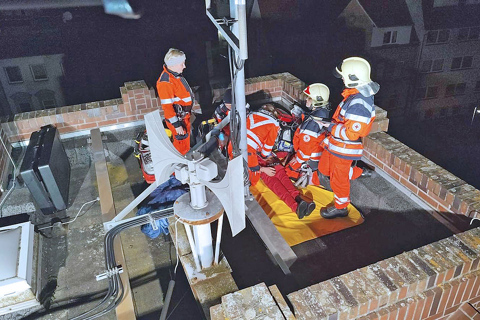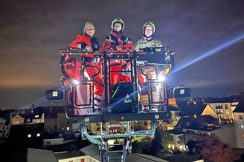 Im zweiten Teil wartete eine besondere Herausforderung: eine Reanimation auf dem Schlauchturm der Delitzsch Wehr – in luftiger Höhe, bei sehr begrenztem Platz, mittlerweile dunkler Arbeitsumgebung und schwieriger Logistik. Das Szenario hierbei: ein Techniker erlitt bei der Wartung der Sirenenanlage einen Stromschlag und wurde wiederbelebungspflichtig. Sämtliche Einsatzkräfte und Ausrüstung mussten über die Drehleiter nach oben transportiert werden. Auf engstem Raum führten die Auszubildenden anschließend die Reanimationsmaßnahmen strukturiert und konzentriert durch, bevor der Patient kontrolliert wieder zu Boden gebracht wurde.