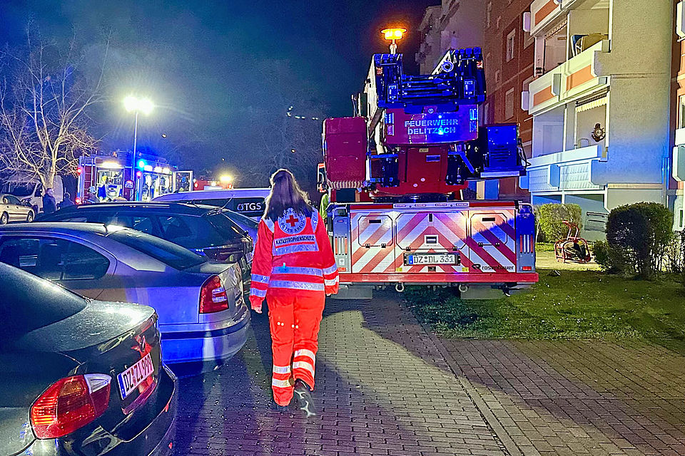 Feuerwehr und DRK sind die Organisatoren dieser traditionellen Veranstaltung an Gründonnerstag – da ging es zu einem Wohnhausbrand in den Delitzscher Westen.